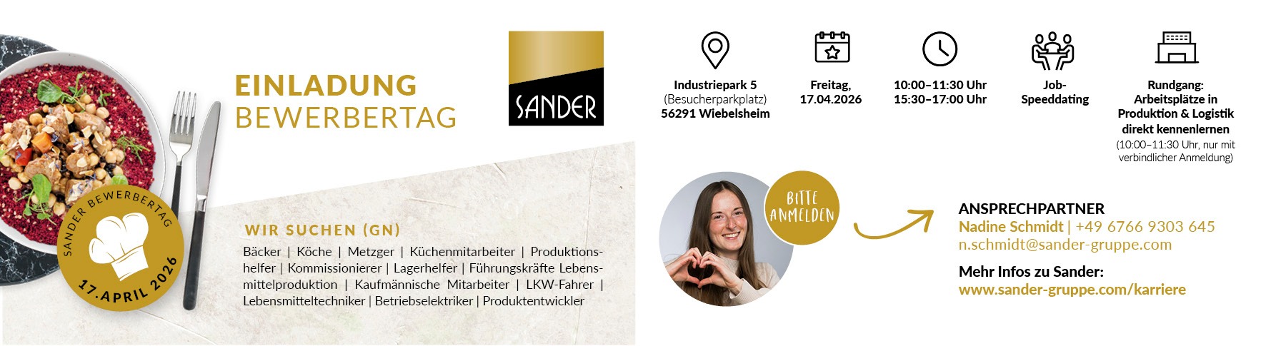 Wir laden Dich herzlich zum Bewerbertag am Freitag, 17. April 2026, an unserem Standort im Industriepark 5, 56291 Wiebelsheim (Besucherparkplatz) ein. Lerne uns persönlich kennen und entdecke Deine beruflichen Möglichkeiten bei uns!